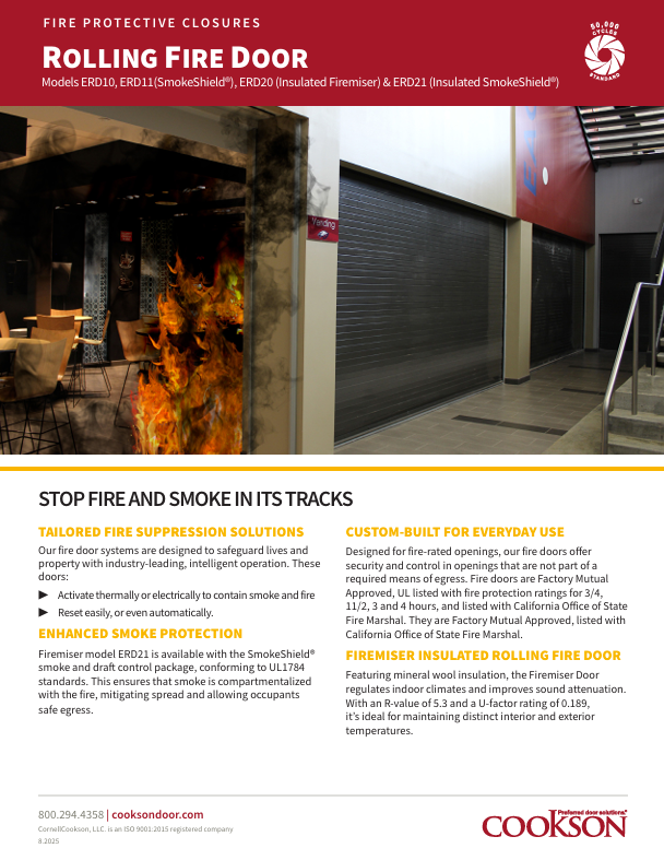 Our fire rated rolling doors are also available with an optional SmokeShield® package. This package adds smoke and draft control which is listed to UL1784, assuring that smoke is compartmentalized with the fire and not spread throughout the facility.