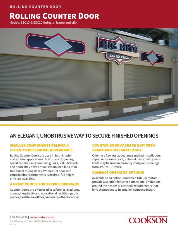 Commonly utilized in cafeterias, concession stands and ticket booths, our Rolling Counter Doors provide accessibility and security in interior and exterior finished wall openings. These doors are manufactured with smaller, more aesthetically pleasing door components – such as the guides, slats, brackets and hood – than traditional rolling doors, so they require minimal headroom and can be custom-fit into a wide variety of openings.