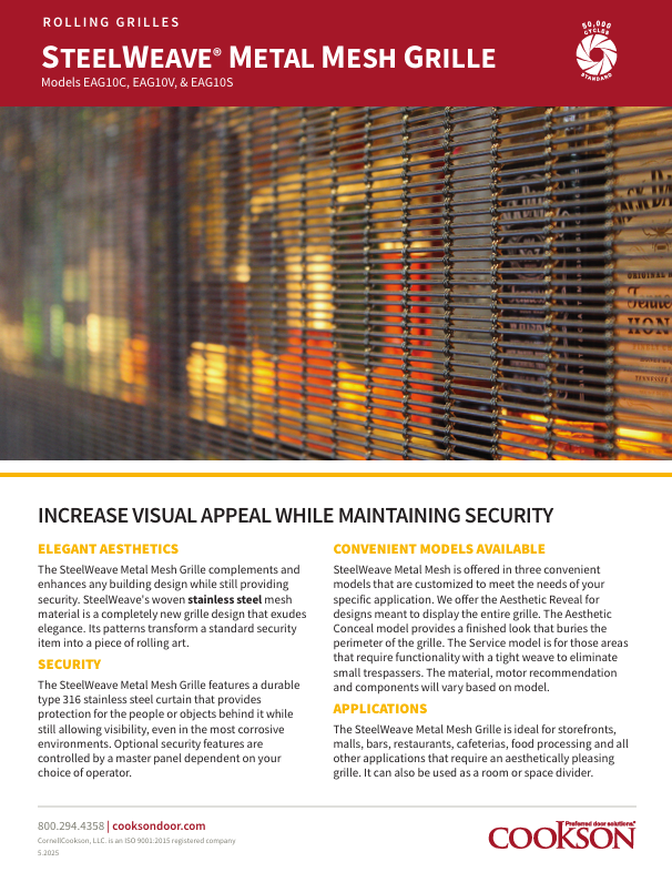 Cookson SteelWeave® mesh security grilles provide reliable protection against theft and intrusion while adding to a building's architecture. These security grilles and mesh counter doors feature durable stainless steel and are suited for use indoors or outside facing the elements.